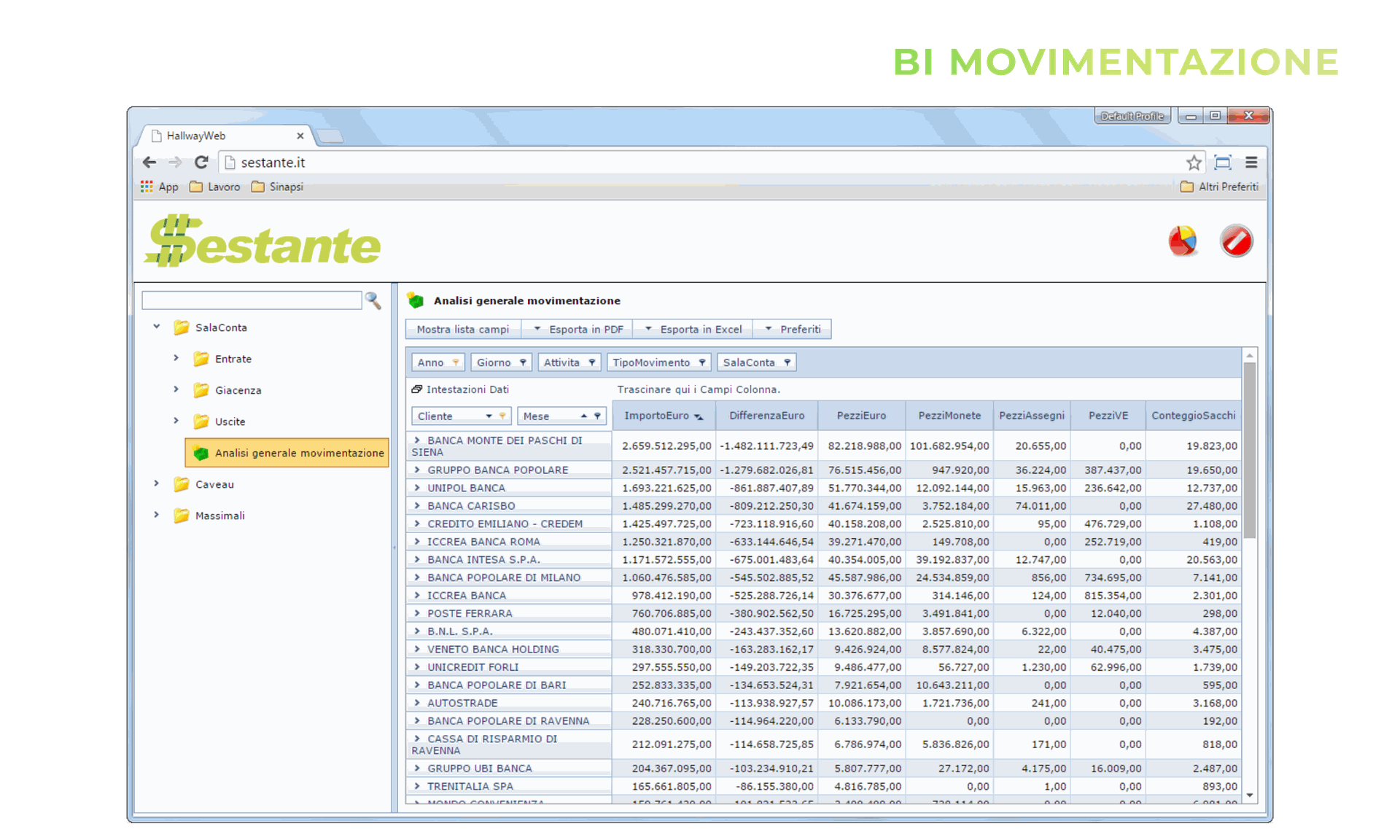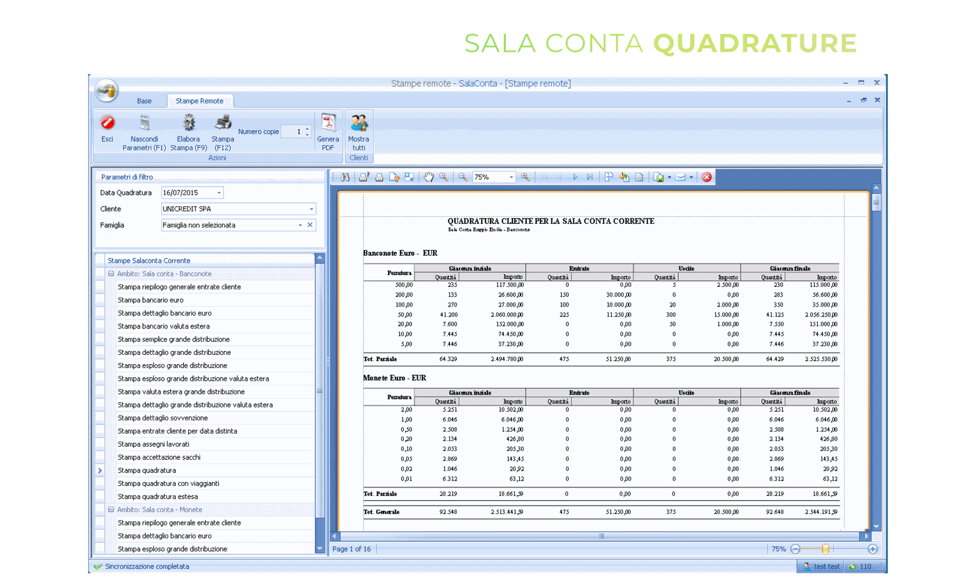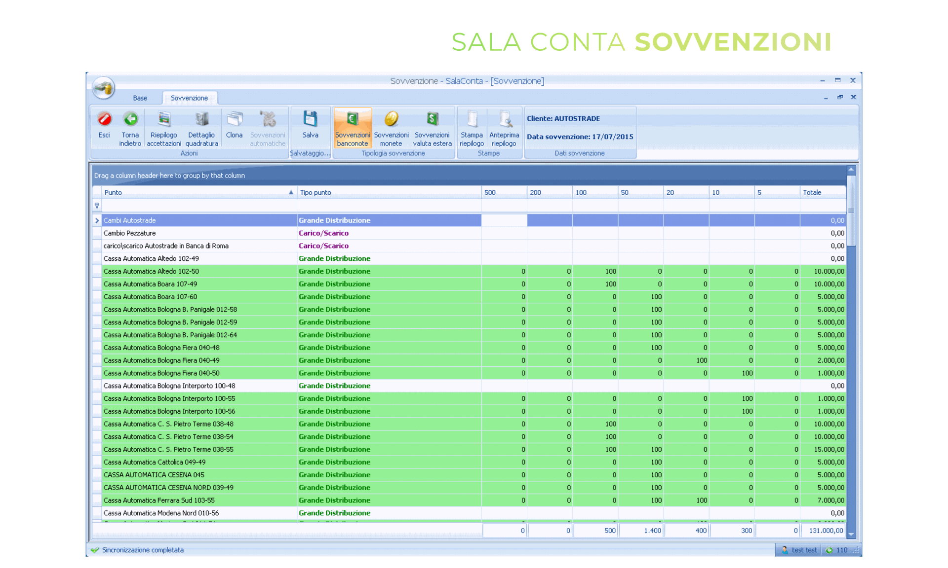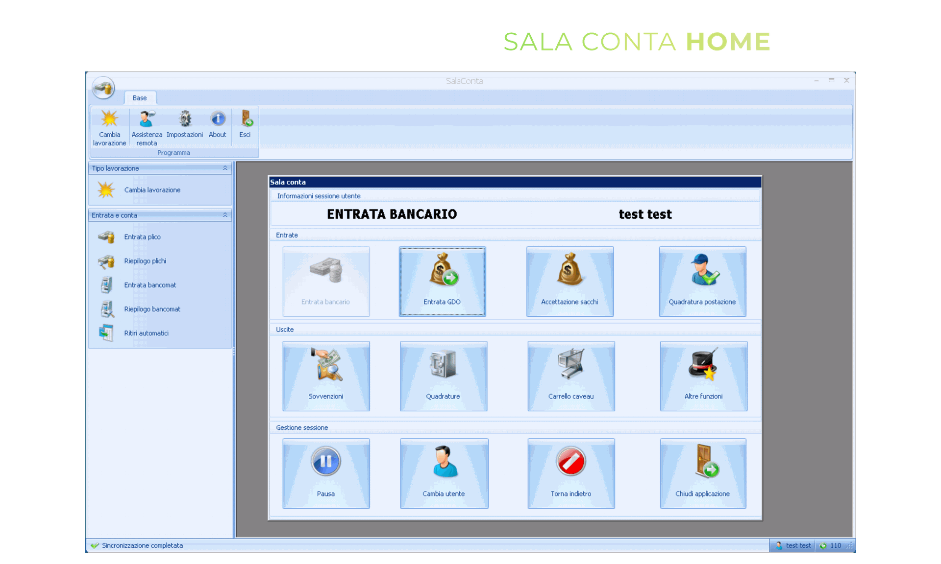 Sala conta è il modulo che supporta gli operatori e i responsabili nella gestione quotidiana delle attività. Il software è pensato per un uso semplice ed ergonomico così da essere un aiuto e non un intralcio per il già complesso lavoro di chi è addetto alle fasi di conta dei valori.